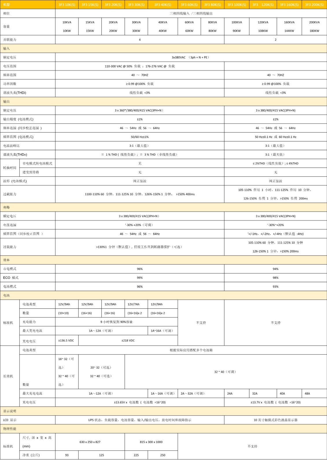 | 3F3 100KS | 100KVA/100KW,雙輸入,內(nèi)模塊設(shè)計,電池±16-±20節(jié)可選,尺寸:1000*430*1200 |